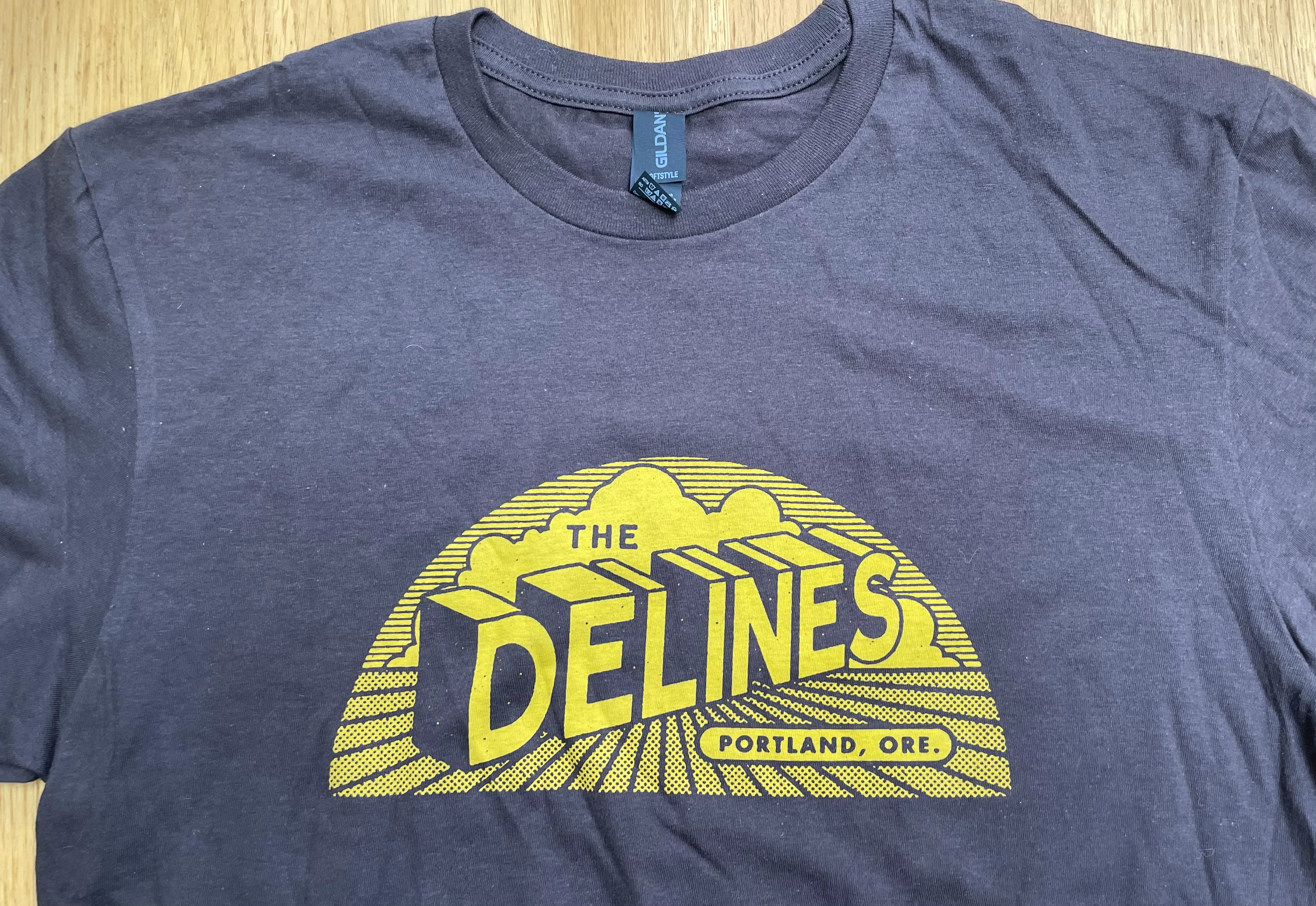 New Delines t-shirt available in Medium, Large and XL. We will have Small and XXL available later in the year. The brown is a chocolate/UPS colour.